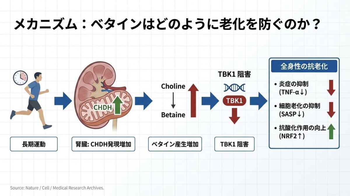 - 実験結果: ベタインの補充は、TANK結合キナーゼ1(TBK1)を阻害することによって、炎症および細胞老化を抑制し、酸化ストレスへの抵抗力を高める経路(NRF2など)を活性化させた。これにより、実際に運動を行っていない老化マウスにおいても、多臓器にわたる広範な抗老化作用が確認された。