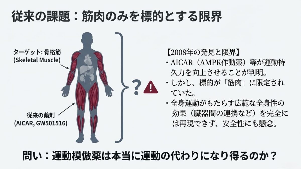 この分野の研究は過去10年以上にわたって進められてきました。例えば2008年には、「AICAR」という物質が、運動していないマウスの筋肉を「持久走トレーニングをした状態」のように変化させることが発見され、大きな話題となりました。しかし、これまでの研究で見つかった物質は、主に「筋肉」だけに作用するものが多く、運動が全身(心臓、脳、肝臓、血管など)にもたらす広範なメリットを完全には再現できていないという課題がありました。