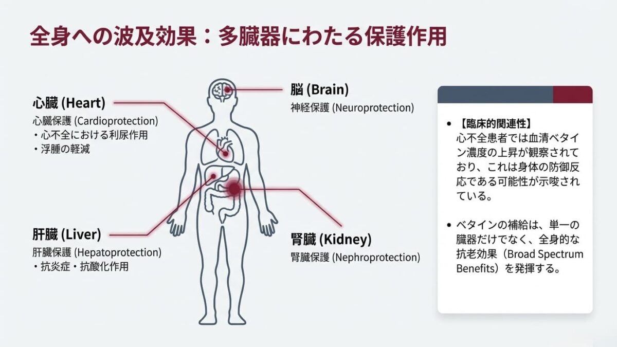 - 腎臓の重要性: 運動による遺伝子発現の変化は、骨格筋や肝臓よりも「腎臓」で最も顕著に現れることが明らかになりました。ベタインは主に腎臓(および肝臓)で合成されることが確認されました。