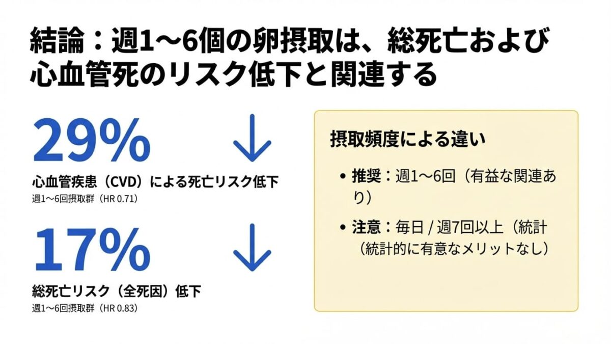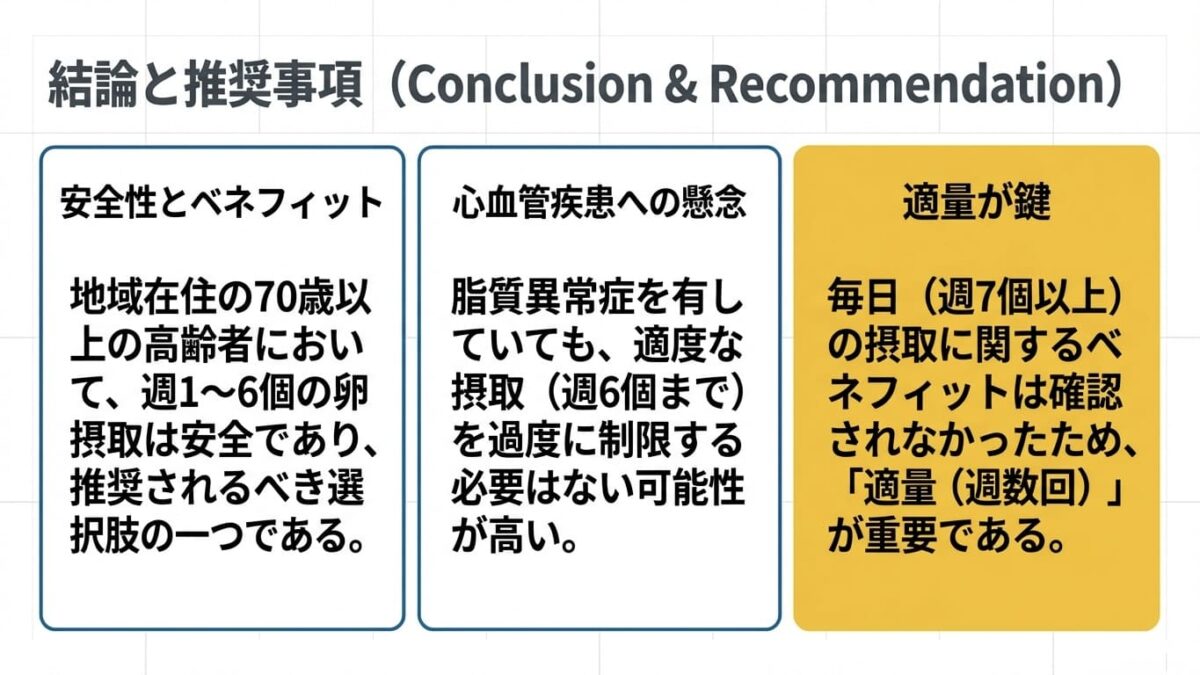 本研究の結論として、地域で生活する70歳以上の高齢者において、週に1~6回程度の卵摂取は安全であり、心血管疾患予防や長寿の観点から推奨される食習慣である可能性が示されました。