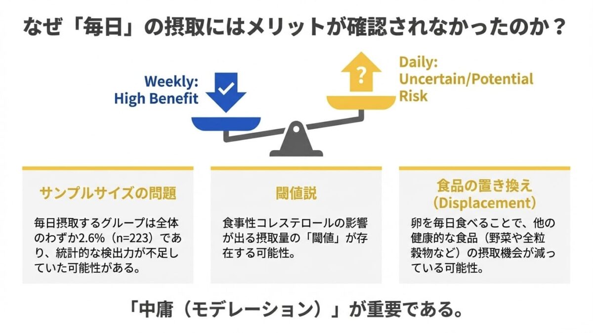 一方で、「毎日(週7回以上)」卵を食べるグループでは、これらの有益な効果は観察されませんでした。統計的には「有意差なし」という結果でしたが、ハザード比(リスクの倍率)は1.20~1.43と、むしろ死亡リスクが高まる方向の数値を示しました。ただし、このグループは参加者全体のわずか2.6%しかおらず、サンプルサイズ不足により偶然の可能性を排除できないため、著者は「毎日食べることの有益性は確認されなかった」と慎重に結論付けています。