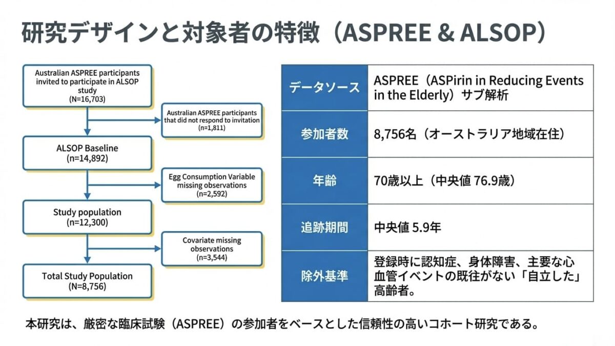 本研究は、70歳以上の高齢者における卵の摂取頻度と死亡リスク(全死亡、心血管疾患死、がん死)の関連を調査した前向きコホート研究です。