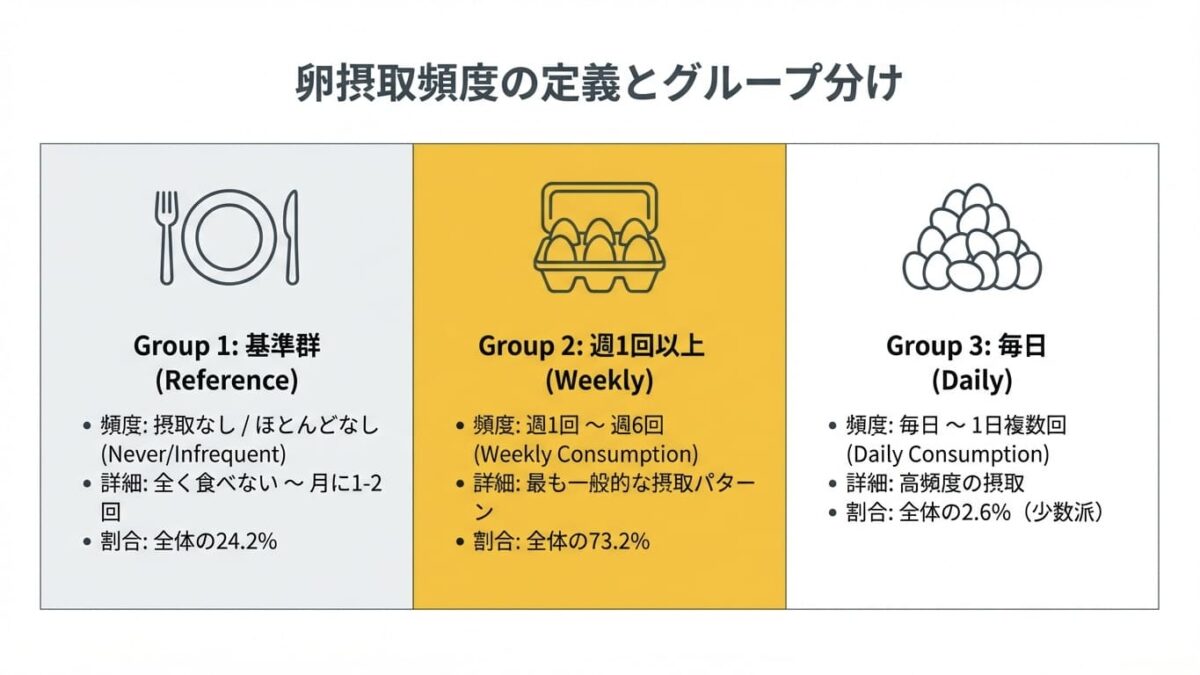 • 曝露因子(介入): 食事摂取頻度調査票(FFQ)による卵の摂取頻度。以下の3群に分類。