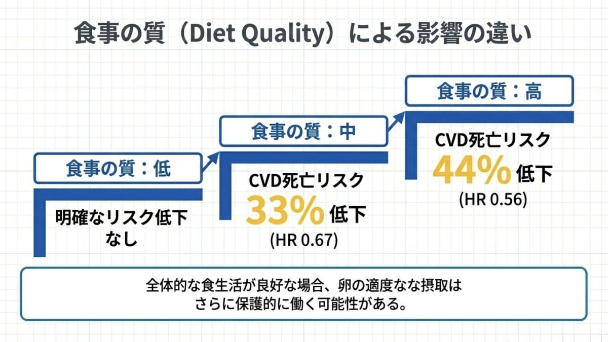 また、過去の研究では、欧米の食事パターン(高カロリー、低運動)の中で卵を摂取することの害が指摘されることがありましたが、本研究の対象者は比較的健康意識が高く、全体的な食事の質も考慮した上で分析が行われています。その結果、食事の質が良い人ほど卵のメリット(CVD死亡リスク低下)が強く出る傾向が見られました。