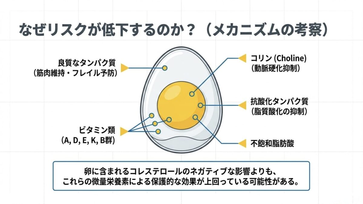 なぜ週に数回の卵摂取が良い結果をもたらしたのでしょうか? 論文ではいくつかのメカニズムが考察されています。