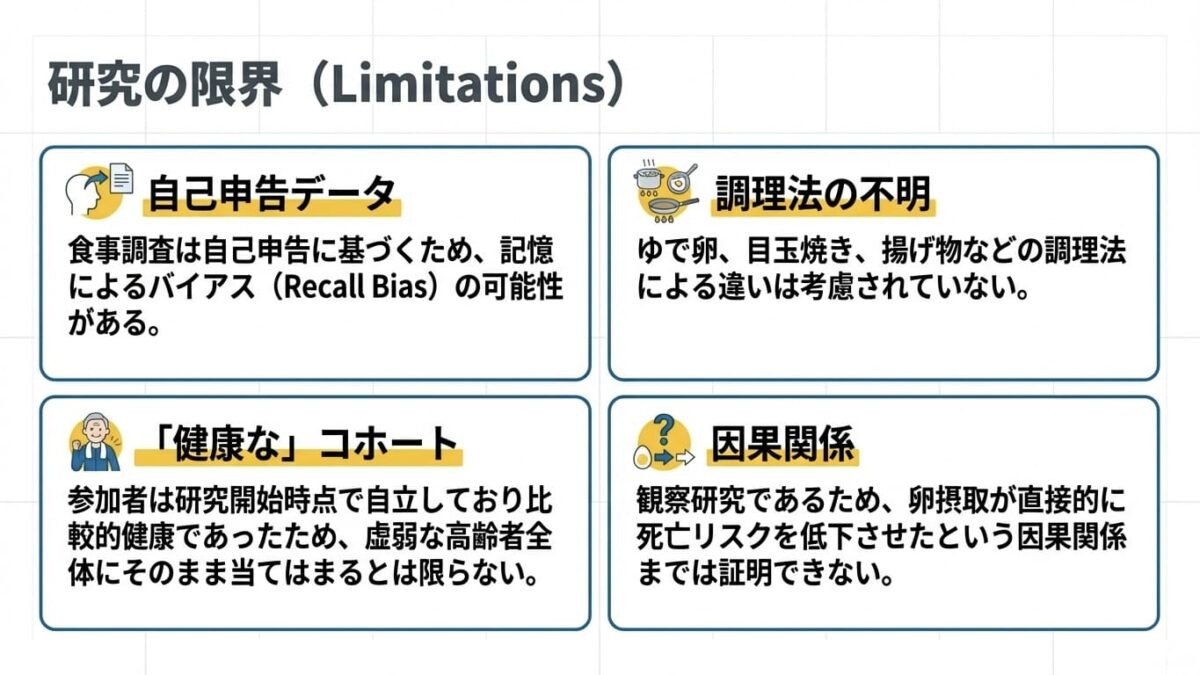 • 因果関係の証明: 観察研究であるため、「卵を食べたから長生きした」という直接的な因果関係までは証明できない。隠れた他の要因(残余交絡)が影響している可能性がある。